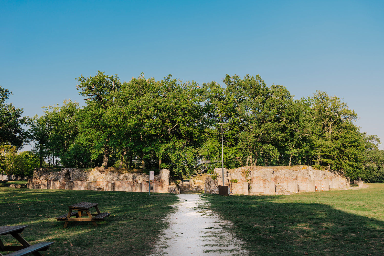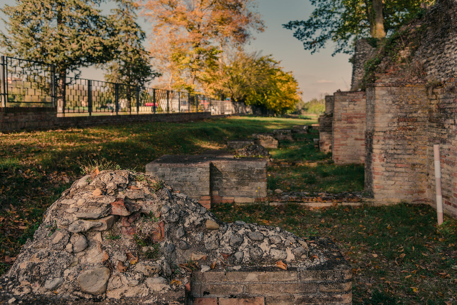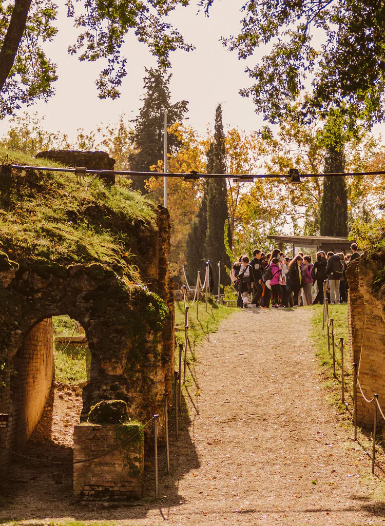Dalla Rocca, che come un’imponente sentinella veglia sui campi e le colline, il percorso di visita del Parco Archeologico, che si snoda attraverso strade e sentieri che si aprono su inaspettati e suggestivi scenari, consente di cogliere nella sua interezza la struttura di una tipica città romana.